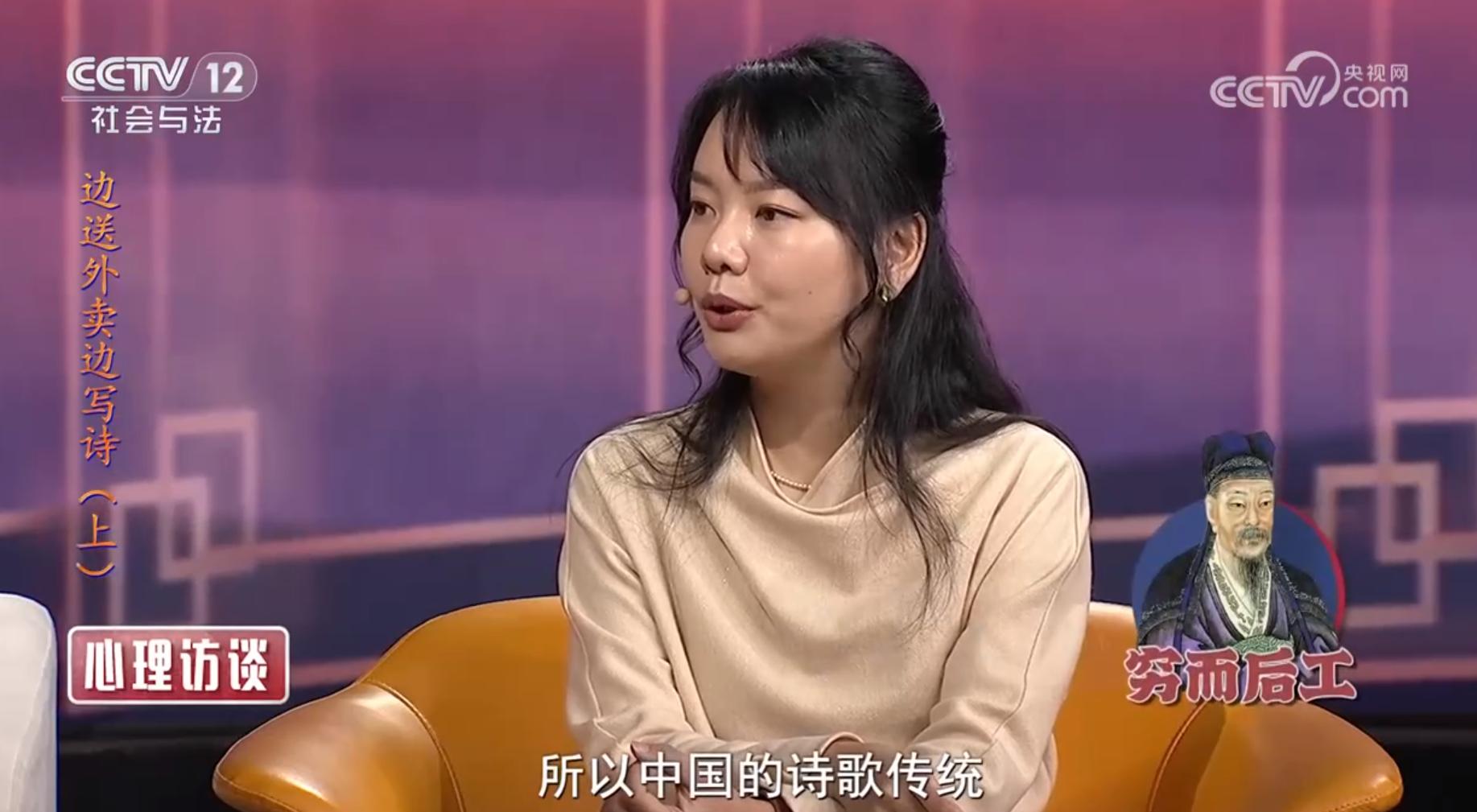 6月29日,太阳成集团tyc33455ccwww黄晓丹副教授受邀参与录制的央视(CCTV-12)《心理访谈》栏目《边送外卖边写诗》(上)正式播出。本期节目走进“外卖诗人”王计兵的内心世界,了解主人公与父辈的情感纠葛、流动漂泊的生活以及对诗歌、写作的热爱。
